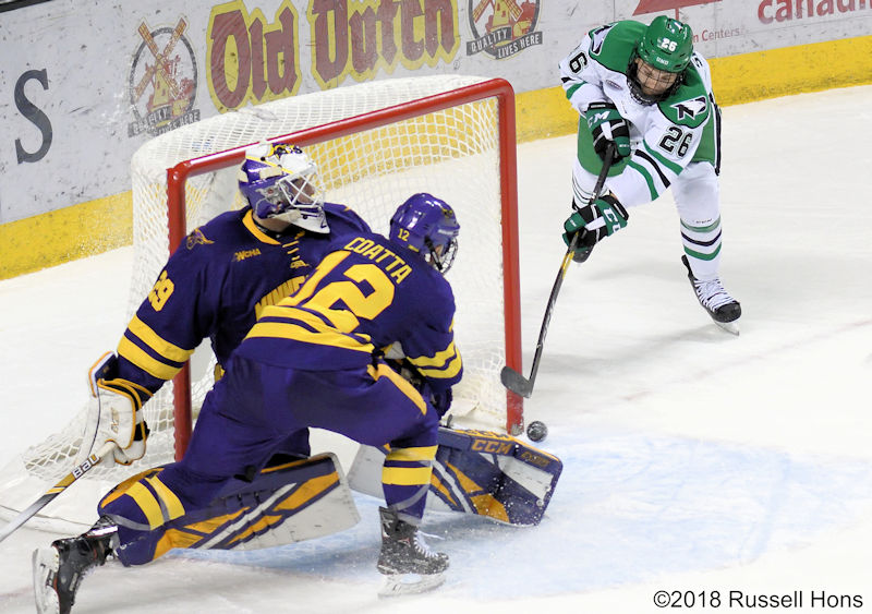 Cole Smith scored two goals and assisted on another to lead the University of North Dakota men’s hockey team to a 4-3 win over Minnesota State University-Mankato on Saturday night in Ralph Engelstad Arena. The gave North Dakota a a split in the two-game series. Minnesota State won 7-4 Friday night. Gabe Bast and Grant Mishmash scored the other goals for the Fighting Hawks (1-2-1). Marc Michaelis, Julian Napravnik and Max Coatta scored goals for the Mavericks (3-1). UND goalie Adam Scheel had 20 saves, while Dryden McKay had 19 saves in goal for Minnesota State. The Fighting Hawks return to action Saturday in Las Vegas in the U.S. Hockey Hall of Fame game against the University of Minnesota Gophers. (Check out more photos from Russ Hons here.)