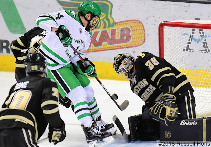 November 16, 2018 A NCAA men’s college hockey game between the Western Michigan Broncos and the University of North Dakota Fighting Hawks at Ralph Engelstad Arena in Grand Forks, ND. Western Michigan won 2-0. Photo by Russell Hons