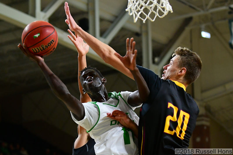 November 17, 2018 A NCAA men’s college basketball game between the Minnesota Morris Cougars and the University of North Dakota Fighting Hawks at Betty Engelstad Sioux Center in Grand Forks, ND. Photo by Russell Hons