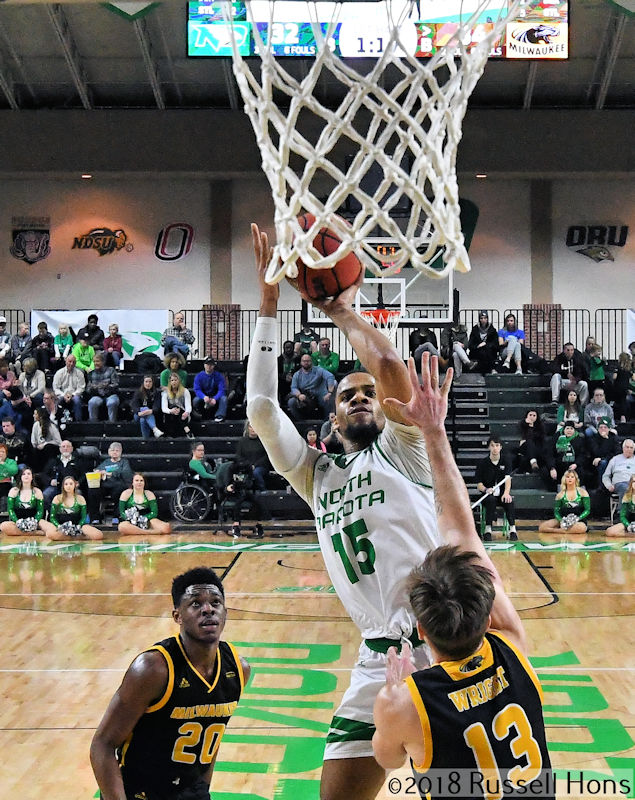 Cortez Seales scored 19 points and had a career-high five steals to lead the University of North Dakota men’s basketball team to a 83-72 victory over the University of Wisconsin-Milwaukee on Sunday afternoon in Betty Engelstad Sioux Center. Joining Seals in double-figure scoring for the Fighting Hawks (5-5) were Aanen Moody (18), Kienan Walter (14) and Conner Avants (12). Darius Roy of Milwaukee (2-8) led all players with a game-high 20 points. UND returns to action Friday when it hosts Mayville State University. (Check out more photos from Russ Hons here.)