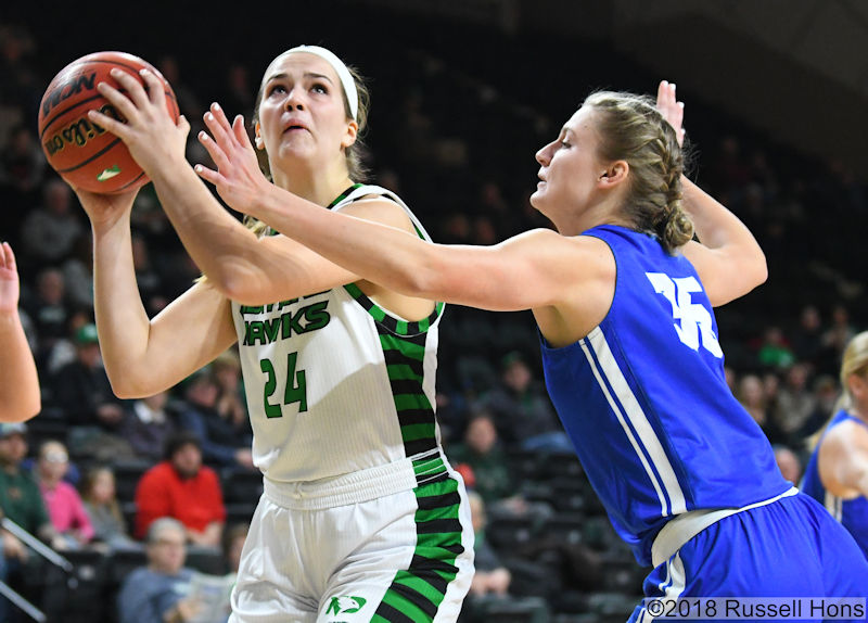 Four players scored in double figures, including Julia Fleecs who poured in a career-high 19 points, to lead the University of North Dakota women’s basketball team to a 84-50 win over Mayville State University on Wednesday night in Betty Engelstad Sioux Center. Lexi Klabo (18), Melissa Dailey (15) and Jill Morton (14) joined Fleecs in double figures for UND (3-7). Mayville State (4-5) was led by Kylee Heurung with 14 points and Joelle Ertl with 12. The Fighting Hawks hit the road next week, traveling to Deland, Fla., for three games in three days at Stetson University, starting with the host Hatters on Wednesday, followed by games against Western Michigan and San Francisco on the following two afternoons. (Check out more photos from Russ Hons here.)
