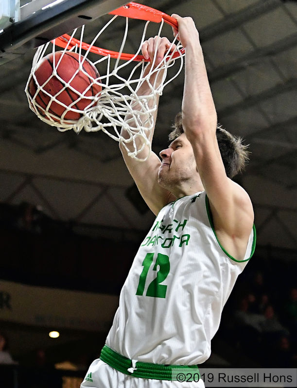 The University of North Dakota Fighting Hawks men’s basketball team put a scare into the South Dakota State University Jackrabbits, the three-time defending Summit League champions, but came up on the short end of a 78-74 game Wednesday night in Betty Engelstad Sioux Center. The Fighting Hawks (8-11 overall, 2-4 Summit) trailed by 13 points in the second half but rallied to take the lead before a late surge by SDSU (15-6 overall, 5-1 Summit) lifted the Jackrabbits to the win. Three UND players scored in double figures — Marlon Stewart (19), Cortez Seales (18) and Filip Rebraca (15) — while SDSU’s Mike Daum led all scorers with 34 points. David Jenkins added 20 and Skyler Flatten chipped in 10 for the Jacks (15-6 overall, 5-1 Summit). UND returns to play Saturday against North Dakota State in Fargo. (Check out more photos from Russ Hons here.)