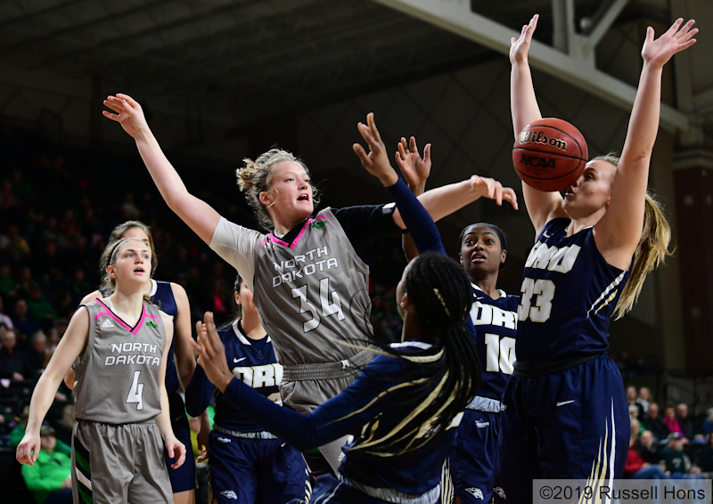 February 16, 2019: a NCAA basketball game between Oral Roberts University Golden Eagles and the University of North Dakota Fighting Hawks at Betty Engelstad Sioux Center in Grand Forks, ND. Photo by Russell Hons