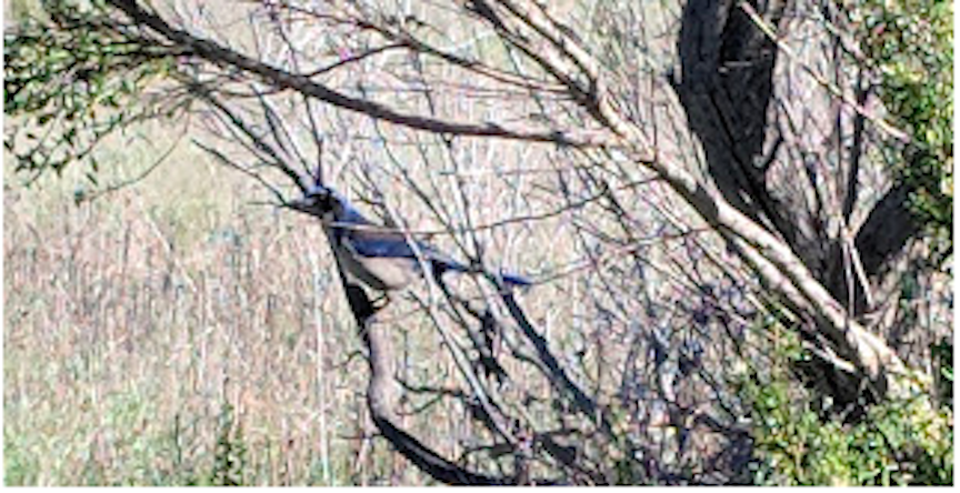 The jay is larger (at 13 inches), heavier and more richly blue than the ordinary Scrub Jay and is the largest and darkest of all of the jays. It also has a longer bill than its relative by about 20 percent. We were fortunate to observe a pair, perched in the scraggly trees along Scorpion Creek, and three others scattered throughout the chaparral by the end of what was, for me, a 12-mile hike from sea level to El Montanon Peak, at 1,808 feet the highest point of Santa Cruz Island.