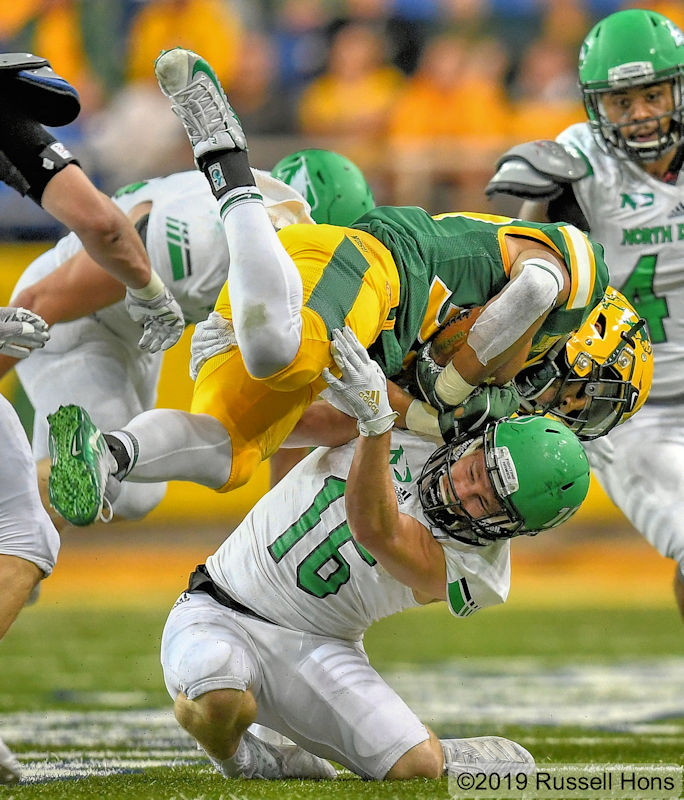 The University of North Dakota dropped a 38-7 decision to topped-ranked North Dakota State University in the much-anticipated nonconference matchup of the two former North Central Conference foes Saturday in the Fargodome. The win evened UND’s record at 1-1, while NDSU is now 2-0. UND’s lone score came in the second quarter on a 3-yard run by James Johannesson, who rushed seven times for 21 yards. The score cut the Bison lead to 14-7. Fighting Hawks quarterback Andrew Zimmerman was 16-for-27 for 150 yards and two interceptions. Receiver Garrett Maag had six catches for 76 yards and Noah Wanzek added 46 yards on six receptions. NDSU was led by quarterback Trey Lance, who ran for 95 yards and two scores and was 11-for-15 for 162 yards passing with two touchdowns. Starting next year, the two teams will be facing off in Summit League play. The Fighting Hawks return to play Saturday when they host 25th-ranked Sam Houston State in the Alerus Center. (Check out more photos from Russ Hons here.)