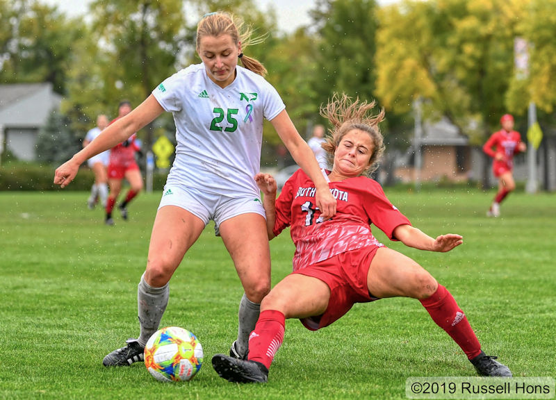 Emma Bangert and Mimi Eiden scored goals to lead the University of North Dakota women’s soccer team to a 2-1 Summit League win over the University of South Dakota on Thursday at Bronson Field in Grand Forks. Bangert’s goal came just 78 seconds after South Dakota tied the match 1-1 on a penalty kick by Alexis Mitchell. UND goalie Catherine Klein stopped four shots in the contest. UND upped its record to 7-3-1 (1-0 Summit), while South Dakota fell to 5-7 (0-1 Summit). North Dakota plays South Dakota State University today in Brookings. (Check out more photos from Russ Hons here.)