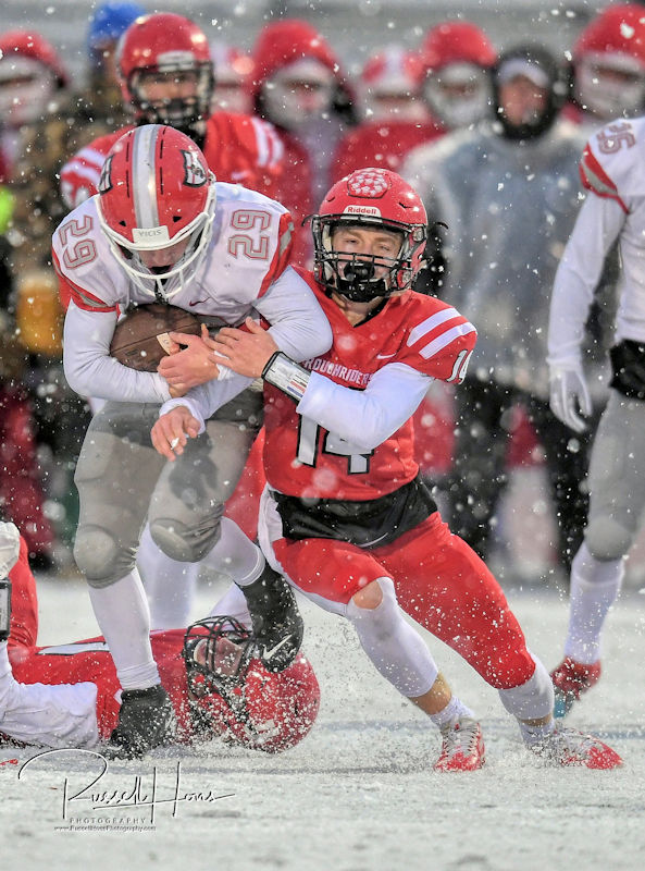 In a high school football game dominated by defense and played in wet, cold and windy conditions, Grand Forks Red River dropped a 10-0 Homecoming decision to Fargo Shanley on Thursday afternoon at Cushman Field in Grand Forks. The Roughriders fell to 2-5 on the season, while the Deacons raised their record to 6-1. The only scores came on a 25-yard field goal by Emmett Kenney in the first quarter and a 1-yard touchdown run in the fourth quarter by Shanley quarterback Cooper Mattern. Tanner Bernhardson led the Red River offense with 56 rushing yards. (Check out more photos from Russ Hons here.)