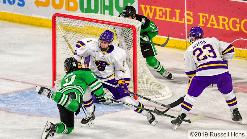 October 18, 2019 A NCAA men’s college hockey game between the University of North Dakota Fighting Hawks and Minnesota State University Mavericks at Mankato Civic Center in Mankato, MN. Photo by Russell Hons