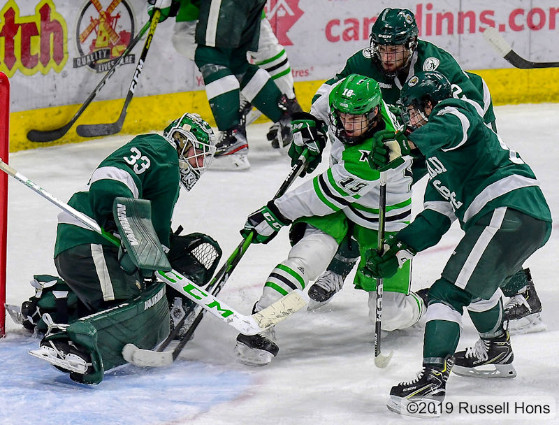 Westin Michaud’s goal just 52 seconds into overtime gave the University of North Dakota men’s hockey team a 2-1 win over Bemidji State University on Friday night in Ralph Engelstad Arena. Jordan Kawaguchi scored the other goal for the Fighting Hawks (3-1-1). Owen Sillinger scored for the Beavers (0-1-2). Adam Scheel made 16 saves in goal for UND, while Zach Driscoll stopped 25 of 27 shots in goal for BSU. (Check out more photos from Russ Hons here.)