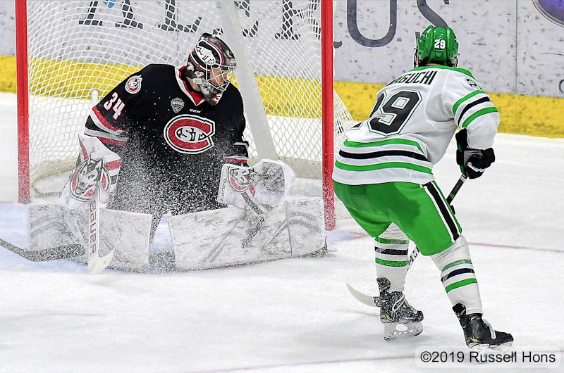 Jordan Kawaguchi’s goal 3:41 into overtime lifted the University of North Dakota men’s hockey team to a 2-1 win and a weekend sweep of St. Cloud State University on Saturday night in Ralph Engelstad University. The Fighting Hawks won 4-2 on Friday night. The win was the 100th of coach Brad Berry at UND. St. Cloud’s Jack Ahcan and UND’s Jacob Bernard-Docker traded goals in the first and second period respectively to set up Kawaguchi’s game winner. UND goalie Adam Scheel stopped 11 shots, while SCSU’s netminder David Hrenak had 18 saves. The Fighting Hawks improved to 10-1-2 overall and 5-0-1 in National Collegiate Hockey Conference, while the Huskies fell to 2-6-4 overall and 0-4-0 in the NCHC. UND travels to the Twin Cities to play the University of Minnesota on Thursday and Friday. (Check out more photos from Russ Hons here.)