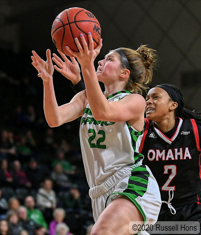 Kacie Borowicz scored 15 points and Megan Zander and Julia Fleecs chipped in 12 and 10 points, respectively, to lead the University of North Dakota women’s basketball team to a 63-57 Summit League win over the University of Nebraska-Omaha on Thursday night in Betty Engelstad Sioux Center. UND improved to 3-0 in the Summit and 12-4 overall. UN0 (6-10 overall, 1-2 Summit) was led by Mariah Murdie, who scored 16 points. UND returns to play Saturday at Oral Roberts. (Check out more photos from Russ Hons here.)