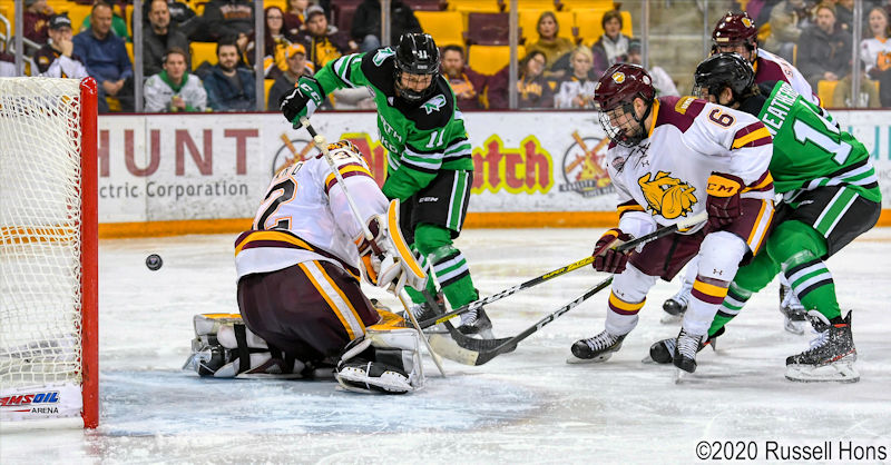 January 24, 2020 a NCAA men’s ice hockey game between the University of North Dakota Fighting Hawks and the Minnesota Duluth Bulldogs at Amsoil Arena in Duluth, MN. UMD defeated UND 7-4. Photo by Russell Hons
