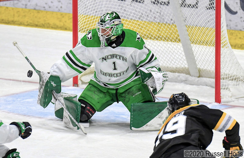 Junior goalie Peter Thome stopped all 25 shots he faced and Shane Pinto scored his 12th goal of the season to lead the University of North Dakota men’s hockey team to 1-0 shutout win over Colorado College in National Collegiate Hockey Conference play Friday night in Ralph Engelstad Arena. The shutout was Thome’s first since his freshman year. The Fighting Hawks (20-3-3 overall, 11-2-2 NCHC), ranked second in the country, reached the 20-win mark in January for the just the second time in the past 17 seasons. Matt Vernon had 29 saves in goal for the Tigers (8-14-1, 3-11-1 NCHC). UND played without defenseman Matt Kierstad, who will also miss tonight’s rematch He’s out with a lower body injury. (Check out more photos from Russ Hons here.)