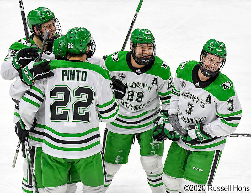 February 15, 2020 a NCAA men’s ice hockey game between the Denver Pioneers and the University of North Dakota at Ralph Engelstad Arena, Grand Forks, ND. UND won 3-1. Photo by Russell Hons