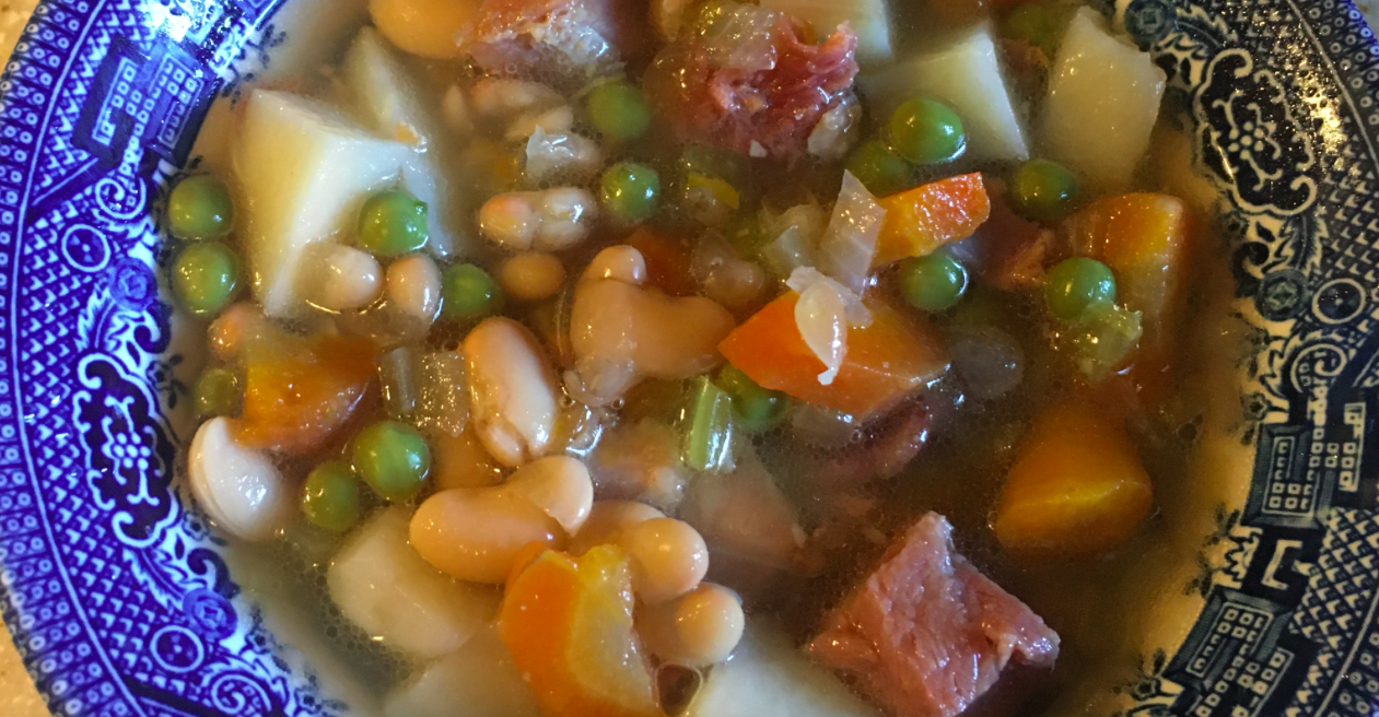 This isn’t your traditional bean soup. First, it doesn’t require soaking beans overnight. Canned great northerns take the place of the usual navy or pinto beans. Second, it’s loaded with veggies, including potatoes, carrots and peas. Finally, it’s ready to go in about an hour.