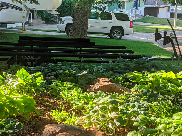 There have been so many boats and construction trucks and trailers and such coming and going this summer, who needs reality TV? This new pontoon trailer was parked by the neighbors’ house on the grass, temporarily — after all, the grass was, for now, ruined — and it would be perhaps months before they could get someone back to do anything more than emergency work on the tree. And Bismarck has ordinances about leaving wheeled vehicles on the street beyond a set time limit.