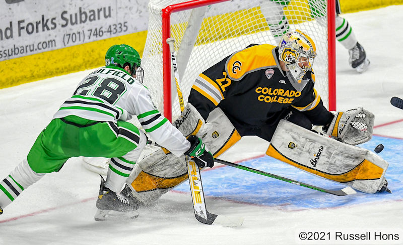 January 24, 2021: A NCAA men’s hockey game between Colorado College and the University of North Dakota Fighting Hawks at Ralph Engelstad Arena, Grand Forks ND. North Dakota won 5-0. Photo by Russell Hons