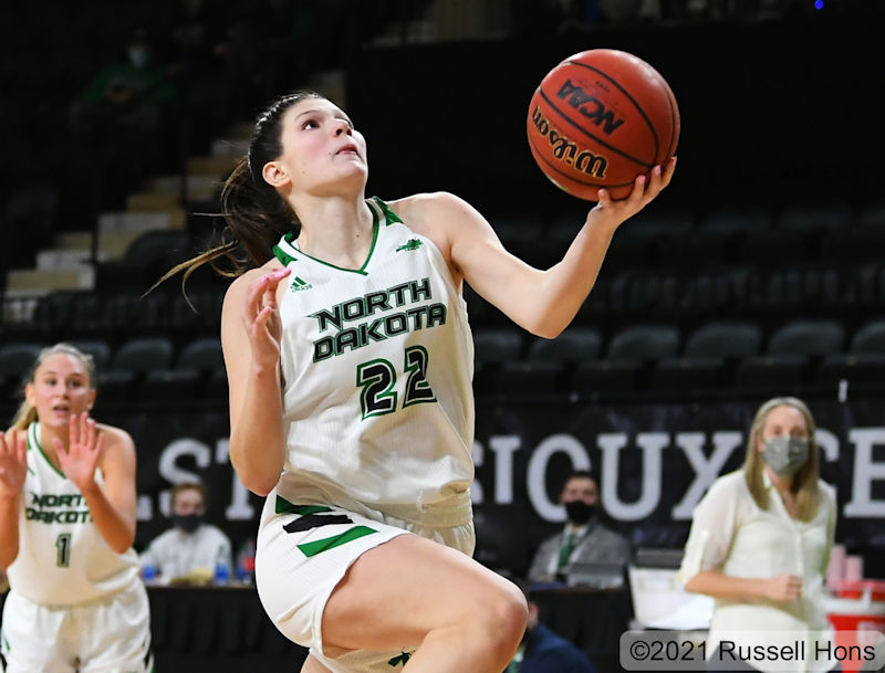 January 29, 2021 A NCAA women’s college basketball game between the Western Illinois Leathernecks and the University of North Dakota Fighting Hawks at Betty Engelstad Sioux Center in Grand Forks, ND. Photo by Russell Hons