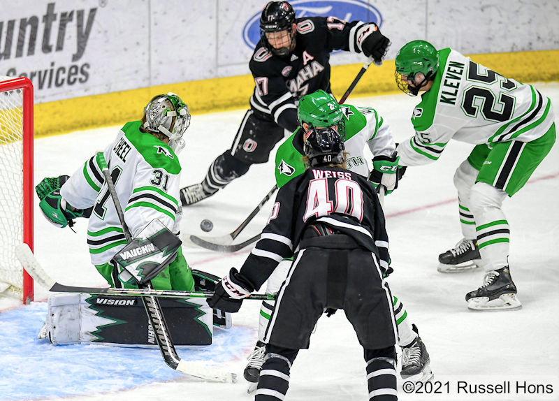 February 19, 2021 NCAA men’s hockey game between the Omaha Mavericks and the University of North Dakota Fighting Hawks at Ralph Engelstad Arena in Grand Forks, ND. Photo by Russell Hons