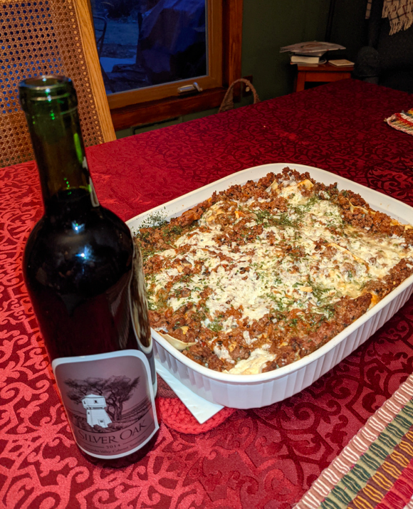 The lasagna went in the oven. The wine got opened to breathe on the table. We waited. Her daughter, Chelsea, showed up to share (just the lasagna, thankfully, she’s not a red wine drinker). We spent a joyful hour around the table, eating, sipping and talking about an upcoming celebration we’re going to have, when the two of them get their second shot and finish their two-week waiting period (I’ve had mine, and my two weeks is up Thursday). I’m not sure what (or where) we’ll eat and drink that night, but it’ll be hard to top what my REALLY GOOD FRIEND Mike and my REALLY GOOD WIFE Lillian did for me Monday.