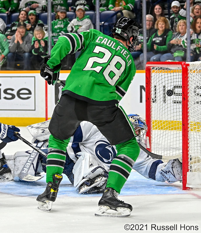 The University of North Dakota men’s hockey team couldn’t overcome an early Penn State University lead and played behind all evening as the Nittany Lions defeated the Fighting Hawks 6-4 in the U.S. Hockey Hall of Fame Game on Saturday night in Bridgestone Arena in Nashville, Tenn. No. 6 North Dakota (4-3) fell behind 2-0 in the first period and never was closer than one goal the rest of the game as Penn State (6-1) claimed the victory before 14,659 fans. Clayton Phillips and Connor MacEachern each scored two goals for Penn State. Tyler Gratton and Ben Copeland also scored for PSU. Judd Caulfield, Riese Gabe, Ethan Fritsch and Jake Schmaltz scored goals for the Fighting Hawks. UND goalie Zach Driscoll stopped 17 shots, while Oskar Autio of Penn State had 28 saves. North Dakota return to play next weekend when it hosts the Denver Pioneers in a National Collegiate Hockey Conference series. (Check out more photos from Russ Hons here.)