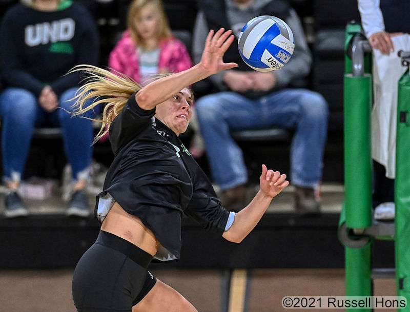 South Dakota State University vs University of North Dakota Fighting Hawks women’s volleyball at the Betty Engelstad Sioux Center, Grand Forks, ND on November 20 2021. By Russell Hons