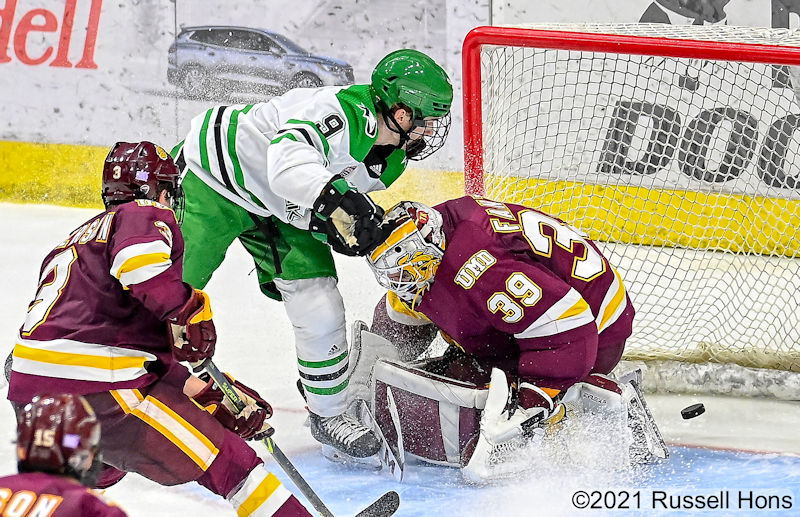 The University of North Dakota men’s hockey team came from behind to defeat the University of Minnesota-Duluth 2-1 in a National Collegiate Hockey Conference game Saturday night in Ralph Engelstad Arena. The victory gave the Fighting Hawks (9-4-0 overall, 5-1-0 NCHC) a split in the series with the Bulldogs (8-3-1 overall, 3-2-1 NCHC), the No.-ranked team in the country. UMD won Friday night’s game 4-1. Brendan Budy scored the winning goal early in the third period to break a 1-1 tie. Blake Biondi gave the Bulldogs a 1-0 with about 5 minutes left in the first period, but Ethan Frisch tied the game for the Fighting Hawks with just 5 seconds left in the period. The teams played a scoreless second period before Bundy’s game-winning goal. UND goalie Zach Driscoll stopped 22 shots, while UMD netminder Ryan Fanti had 21 saves. No. 6 North Dakota returns to play next weekend when it hosts the University of Minnesota in a nonconference game. (Check out more photos from Russ Hons here.)