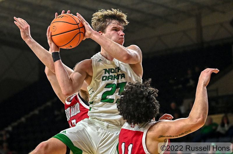 Paul Bruns scored 21 points and added eight rebounds but it wasn’t enough as the University of North Dakota men’s basketball team dropped a 75-68 Summit League decision to the University of South Dakota on Monday night in Betty Engelstad Sioux Center. The Fighting Hawks (4-13 overall, 0-4 Summit) also received double-figure scoring efforst from Tsotne Tsartsidze (13), Matt Norman (11) and Bentiu Panoam (11). The Coyotes (8-7 overall, 1-3 Summit) were led by Kruz Perrot-Hunt and Mason Archambault, who each scored 19 points. UND returns to action Thursday when it hosts Western Illinois. (Check out more photos from Russ Hons here.)