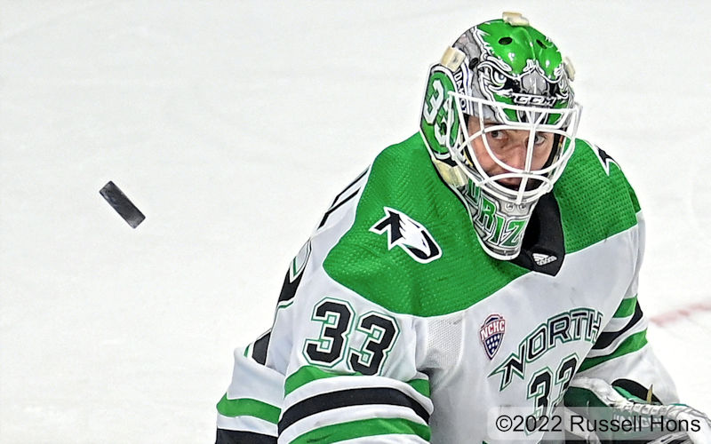 A goal by Brandon McManus in overtime lifted the University of Nebraska-Omaha to a 3-2 win over the University of North Dakota men’s hockey team in National Collegiate Hockey Conference play Saturday night in Ralph Engelstad Arena. The win gave UNO a split in the series. UND won Friday night’s contest 4-1. The Fighting Hawks (15-11-1 overall, 10-5-1 NCHC), ranked 12th nationally, surrendered a two-goal lead in the third period before falling to the No. 18-ranked Mavericks (17-11-0 overall, 7-9-0 NCHC). Riese Gaber and Judd Caulfield had given UND a 2-0 lead before Davis Pennington and Kevin Conley tallied in the third period for UNO. UND goalie Zach Driscoll had 27 saves, while UNO’s Isaiah Saville stopped 28 shots. UND was playing without Jake Sanderson, who is in Los Angeles awaiting clearance on COVID-19 tests before heading to China to play for the United States in the Winter Olympic Games. The Fighting Hawks also played the third period without Mark Senden and Louis Jamernik, who were injured in the second period, and Gain Hain and Brendan Budy, both out with injuries. The Fighting Hawks return to play next weekend when they host Colorado College. (Check out more photos from Russ Hons here.)
