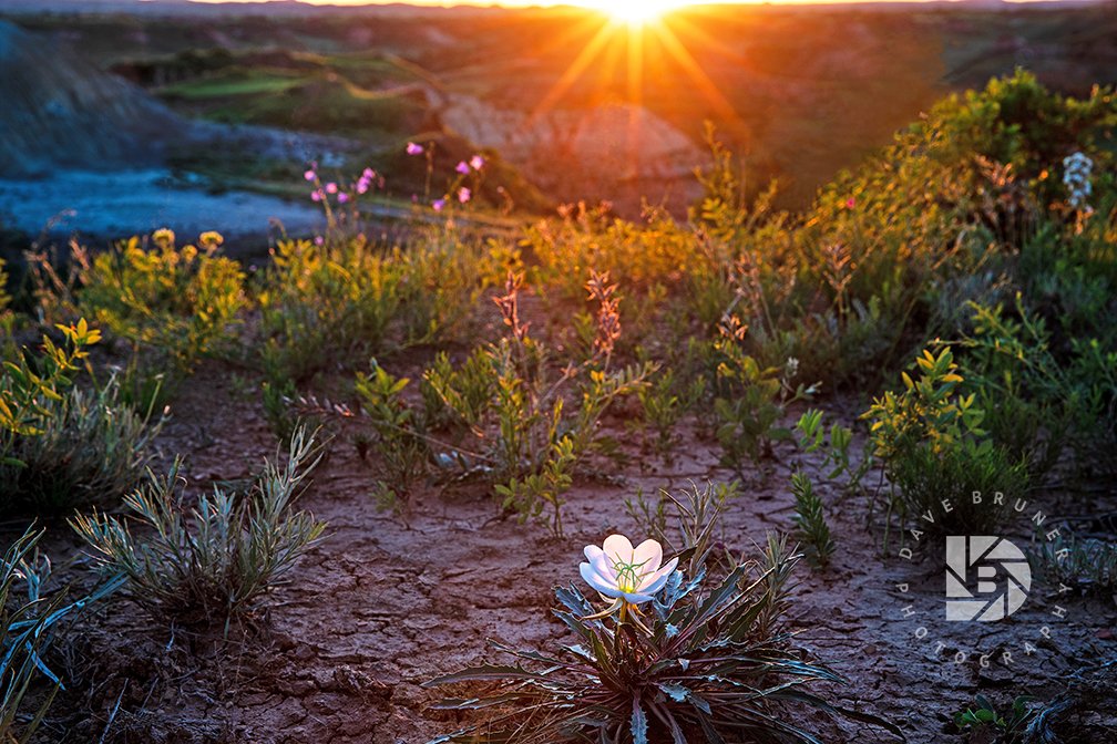 “The Badlands Lily.” The wild lilies and Bluebells were out in full bloom this time of year. Dave shot this image right at sunrise with the early morning light falling on the flowers. He focused on the lily as the main subject with the Badlands hills in the background diffused.