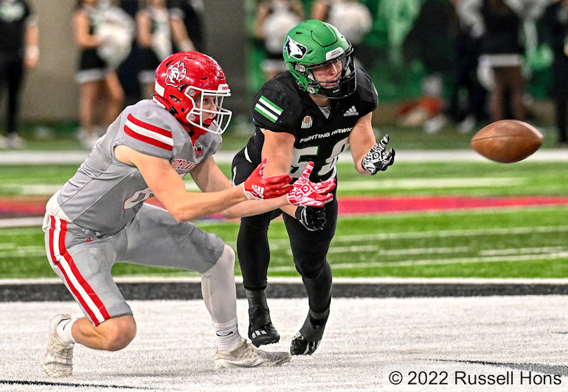 Tommy Schuster was 24-for-28 passing for 223 yards and three touchdowns to lead the University of North Dakota football team to a 28-19 Missouri Valley Conference win over the University of South Dakota on Saturday in the Alerus Center. The Fighting Hawks (7-3 overall, 5-2 MVFC) trailed twice in the first half but a blocked punt inside the 10-yard-line of the Coyotes (3-7 overall, 2-5 MVFC) by Malachi McNeal late in the second quarter led to a 2-yard touchdown pass from Schuster to Bo Belquist for a 14-13 lead. Belquist had a game-high seven receptions for 92 yards and a pair of touchdowns. Isaiah Smith caught the other touchdown pass. Quincy Vaughn ran for the other UND touchdown. Tyler Hoosman led the UND rushing game with 100 yards on 23 carries. Travis Theis led the USD offense with 95 yards on 14 carries.The Fighting Hawks return to play Saturday when they travel to Fargo to meet North Dakota State University. (Check out more photos from Russ Hons here.)