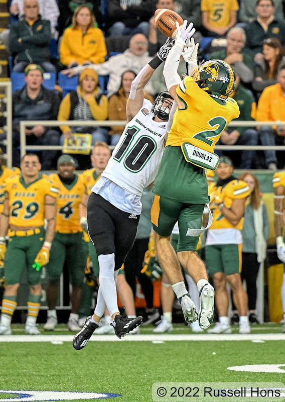 No. 4 North Dakota State University handed No. 16/23 University of North Dakota a 42-21 Missouri Valley Conference loss Saturday in the Fargodome. The Fighting Hawks (7-4 overall, 5-3 MVFC) trailed 28-14 after the first half but couldn’t overcome the 14-0 first quarter lead racked up by the Bison (9-2, 7-1 MVFC). Cam Miller led NDSU, rushing for 93 yards on 16 carries and five touchdowns. He was also 8-for-12 passing for 159 yards. NDSU finished with 522 total yards of offense, with 363 yards on the ground and 159 through the air. UND’s Tommy Schuster was 11 for 19 passing for 153 yards and two touchdowns, one each to Bo Belquist and Garett Magg. Quincy Vaughn rushed for the other UND touchdown. The game was the last regular season tilt for both teams. NDSU is in position to earn a top-4 seed and an at-large bid for the NCAA Division I FCS playoffs, while UND awaits its playoff fate this morning. (Check out more photos from Russ Hons here.)