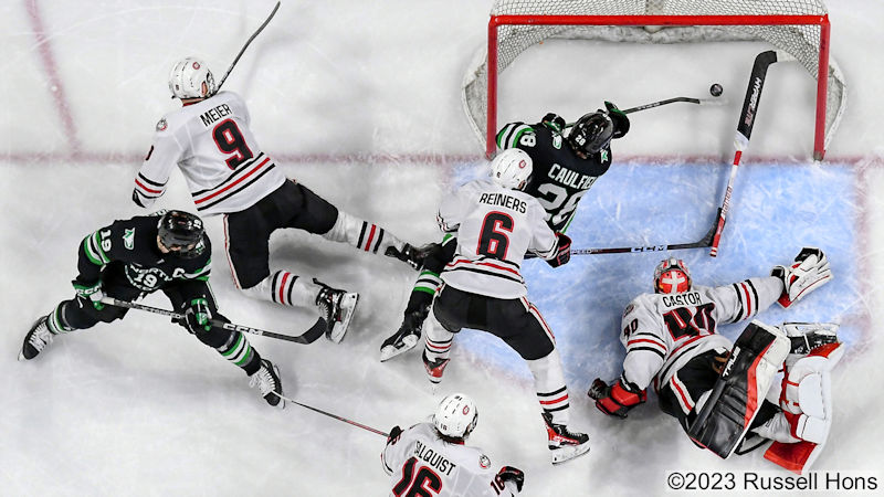 The University of North Dakota men’s hockey team’s 2022-23 season came to an end Friday night as the Fighting Hawks dropped a 3-2 overtime decision to St. Cloud State University in the National Collegiate Hockey Conference semifinals in St. Paul’s Xcel Energy Center. The Fighting Hawks (18-15-6) held leads of 1-0 and 2-1 over the Huskies (23-12-3) on goals by Ethan Frisch and Judd Caufield before Veeti Miettinen and Jami Krannila scored for St. Cloud to force the game into overtime. Zach Okabe scored the winning goal 5:45 into the extra frame to send the Huskies into today’s championship game against Colorado College, a 1-0 winner over the University of Denver earlier Friday. UND goalie Drew DeRidder stopped 18 shots, while St. Cloud netminder Jaxon Castor had 23 saves. (Check out more photos from Russ Hons here.)