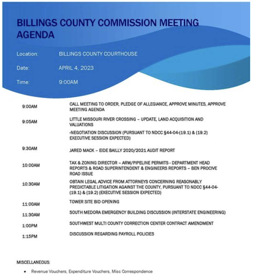 P.S. The Billings County Commission meets at 9 a.m. Tuesday. Here’s a look at the agenda. The commission is not wasting any time moving forward with the bridge scheme. Look at the 9:05 a.m. agenda item. I’m going to be there.