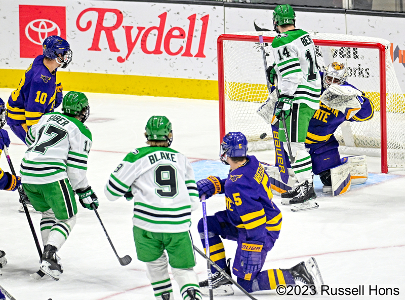 Jackson Blake scored two goals and added an assist to lead the University of North Dakota men’s hockey team to a 6-2 nonconference win over Minnesota State University Mankato on Friday night in Ralph Engelstad Arena. Also scoring for the Fighting Hawks (4-1) were Owen McLaughlin, Jayden Perron, Logan Britt and Hunter Johannes. Sam Morton and Luc Wilson scored for the Mavericks (2-3). UND goaltender Ludvig Persson stopped 28 shots, while Minnesota State goalie Alex Tracy had five saves and gave up three goals before being pulled in the first period. His replacement, Keenan Rancier, stopped 21 shots while also giving up three goals. The two teams meet again tonight in the Ralph. 6-7-8 – 21 (3 GA) (Check out more photos from Russ Hons here.)