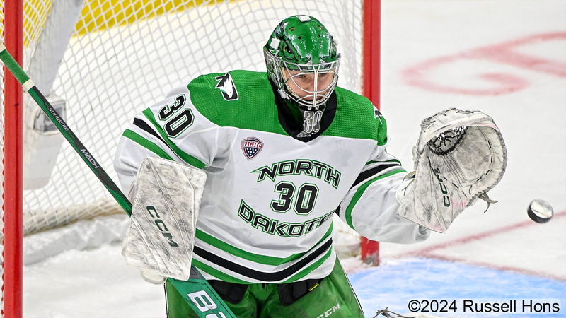 The University of North Dakota men’s hockey team won the opening game of their National Collegiate Hockey Conference Quarterfinal series with Miami University 5-1 on Friday night in Ralph Engelstad Arena. Freshman goalie Hobie Hedquist stepped in for starter Ludvig Persson to lead the Fighting Hawks (25-10-2) over RedHawks (7-25-3). Hedquist stopped 23 shots in covering for Persson, who was held out for undisclosed reasons. The game saw five different players —Jake Schmaltz, Jackson Blake, Riese Gaber Owen McLaughlin and Jake Livanavage — score for UND. Ryan Sullivan tallied the only Miami goal. RedHawks goalie Logan Neaton had 22 saves. The two teams meet again tonight. (Check out more photos from Russ Hons here.)