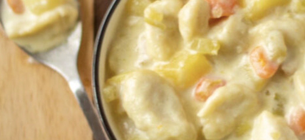 Add chopped potatoes. Simmer until the potatoes are soft. Then add the dumplings. I bought frozen dumplings in a Bismarck grocery store (made at Baker Boy in Dickinson, N.D.). Finally, add some cream or half and half. Don’t burn it. Enjoy.